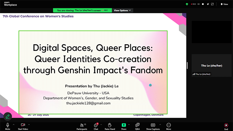 |  | Ms. Thu Le | Digital Spaces, Queer Places: Queer Identities Co-creation through Genshin Impact’s Fandom | DePauw University, United States |
