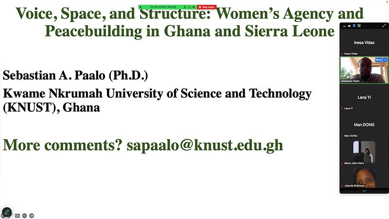 |  | Dr. Sebastian Angzoorokuu Paalo | Voice, Space, and Structure: Women’s Agency and Peacebuilding in Ghana and Sierra Leone | Kwame Nkrumah University of Science and Technology, Ghana |